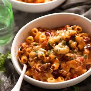 A homemade Chili with the addition of macaroni and cheese = Chili Mac ‘n Cheese! This is terrifically moorish and a fabulous one pot meal. Super quick too