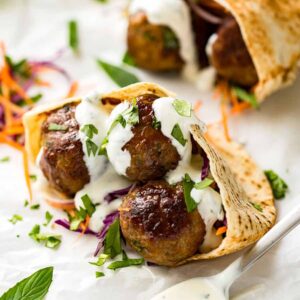 - Serving – Cut pita pockets in half, warm for 10 seconds in the microwave, then pry it open. Stuff with lettuce, tomato, onion, then meatballs (I do 2 per half pocket). Drizzle with Mint Yogurt Sauce and fresh coriander.